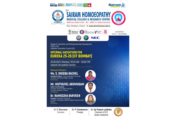 The Research Innovation and Entrepreneurship Development (RIED) Cell and Institution Innovation Council (IIC) of Sri Sairam Homoeopathy Medical College and Research Centre successfully organized the Internal Hackathon for Eureka 25-26 (IIT Bombay) on 25th August 2025.
