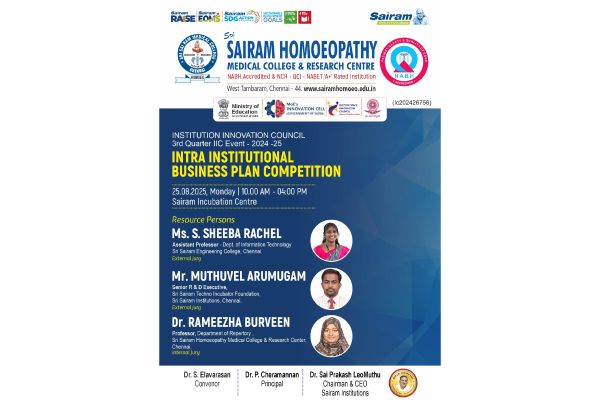 Sri Sairam Homoeopathy Medical College & Research Centre conducted the Intra-Institutional Business Plan Competition under the Institution Innovation Council (IIC) – 3rd Quarter Event 2024-25.